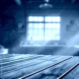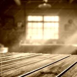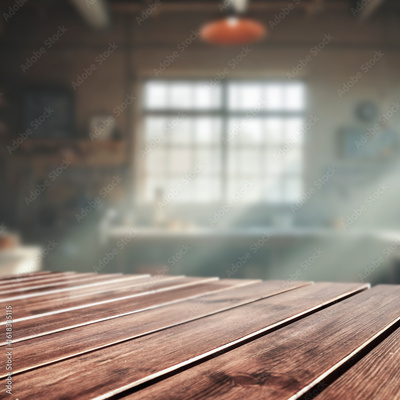 Empty table with product space in artisan workshop with natural window light. Showcasing handmade goods, tools, branding mockups, DIY products or creative workspace concepts.