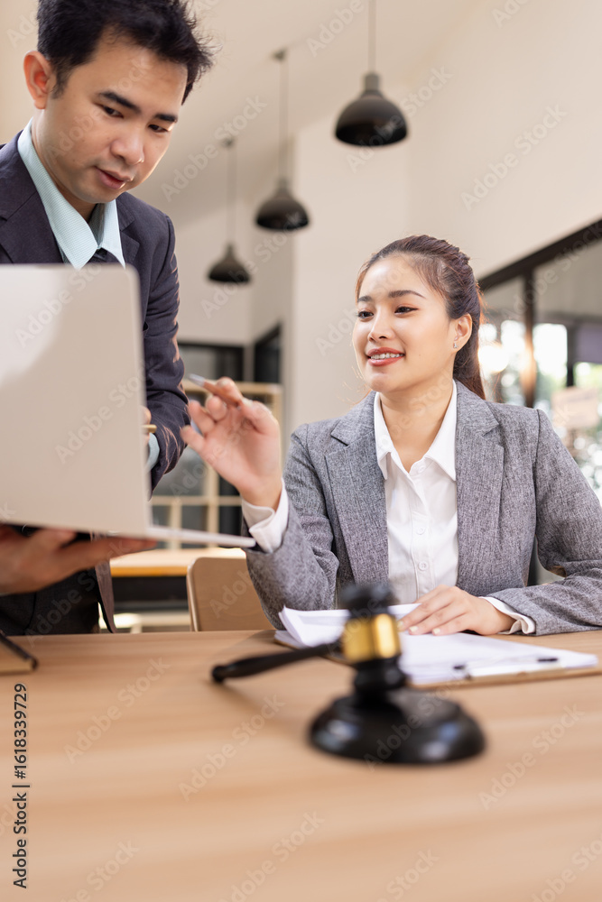 Lawyer with Document Paper and Hammer on Wood table, Judge's Gavel, Law, Justice Symbol, Agreement and Partnership Concept,