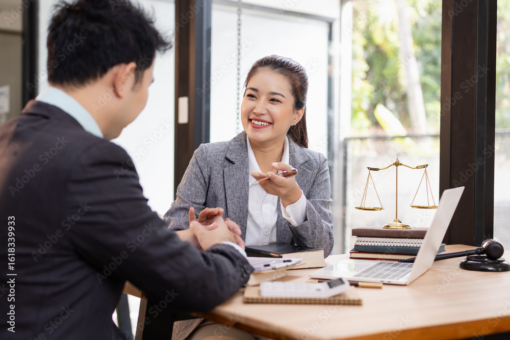 Lawyer with Document Paper and Hammer on Wood table, Judge's Gavel, Law, Justice Symbol, Agreement and Partnership Concept,
