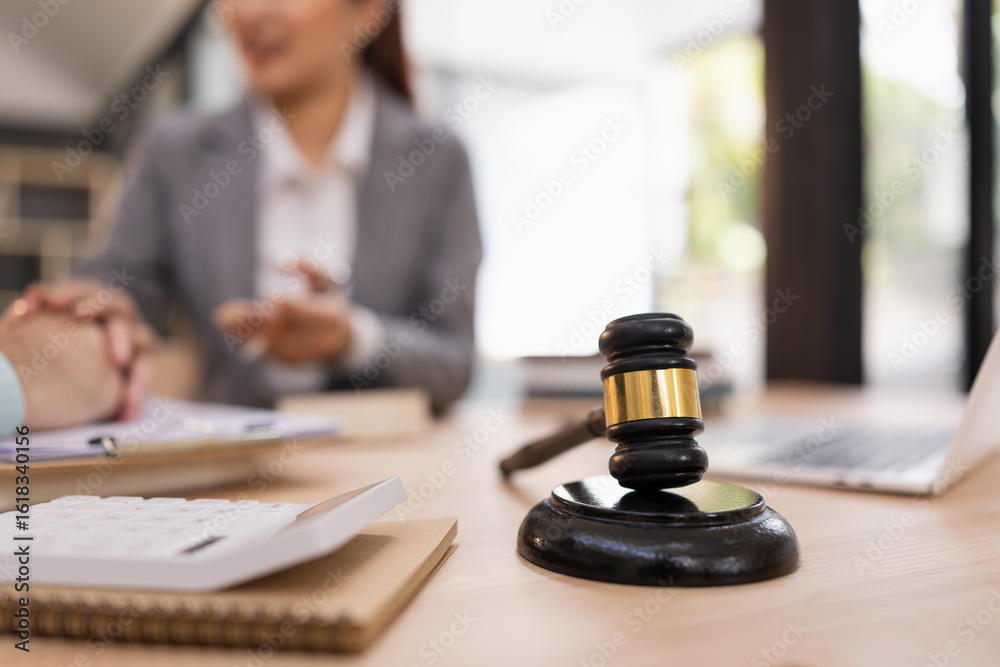Lawyer with Document Paper and Hammer on Wood table, Judge's Gavel, Law, Justice Symbol, Agreement and Partnership Concept,