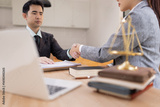 Lawyer Handshake in Business Meeting, Agreement and Partnership, Hammer of Justice,