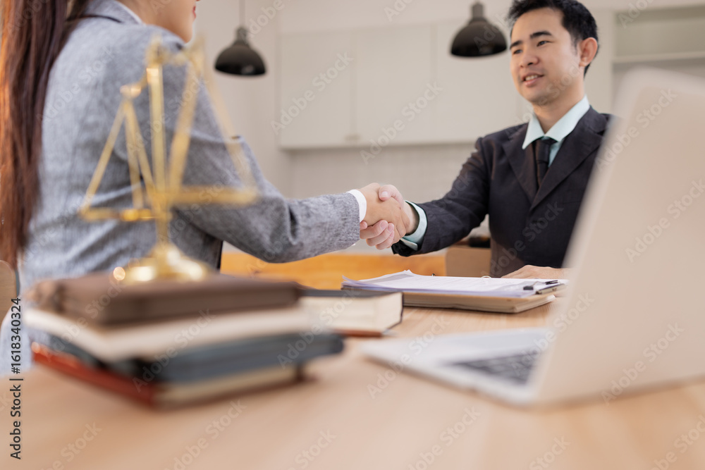 Lawyer Handshake in Business Meeting, Agreement and Partnership, Hammer of Justice,