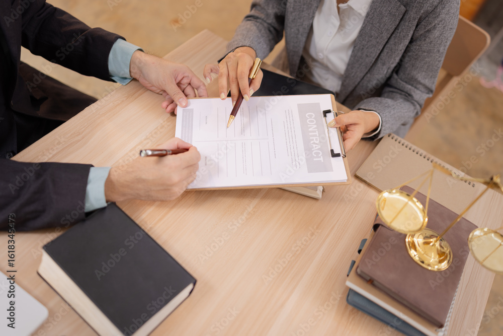 Lawyer Team Working with Documents and Signing Contract at Office Desk.