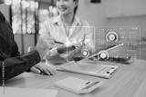 Businessman and woman holding digital tablet with futuristic interface for analytics data dashboard.