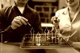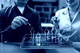 Businessman and woman holding digital tablet with futuristic interface for analytics data dashboard.