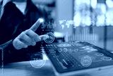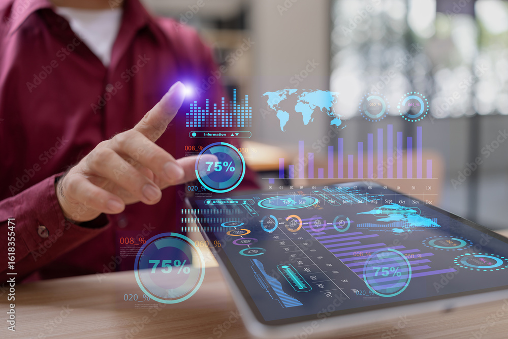Businessman holding digital tablet with futuristic interface for analytics data dashboard.