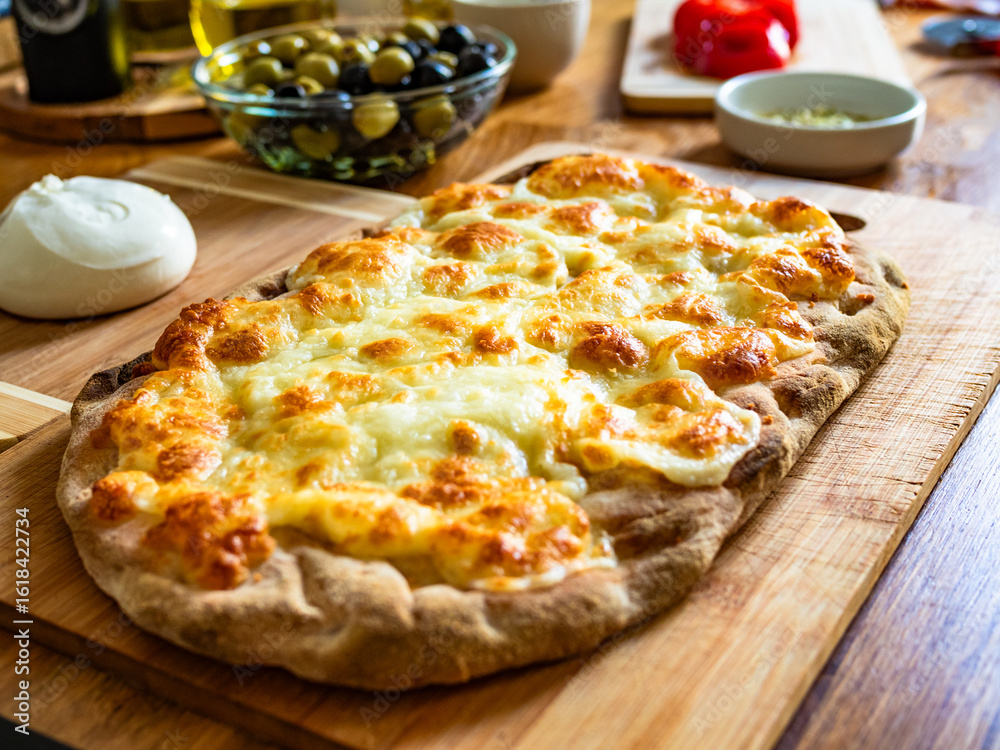 Pinsa bianca white pizza on wooden table