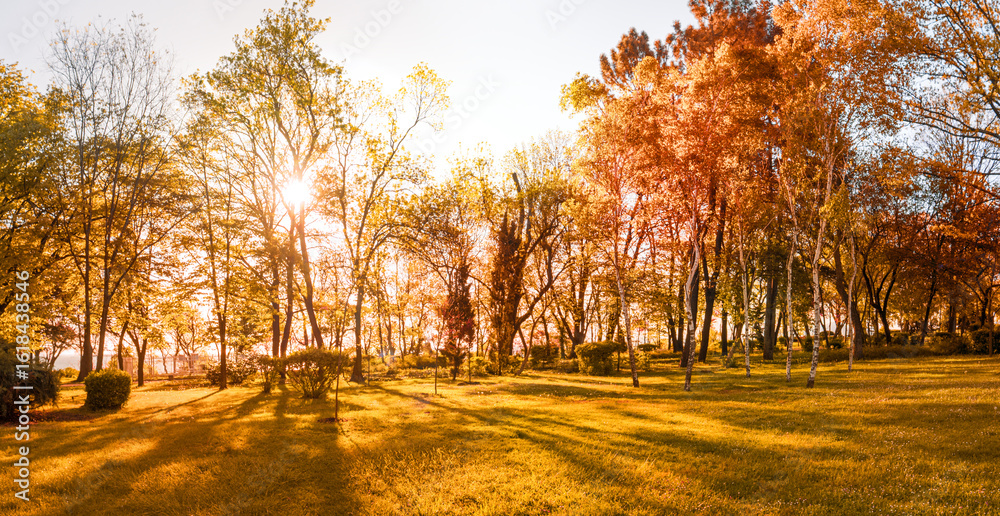 orange fall leaves, autumn natural background in park with sun beams
