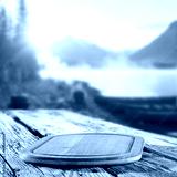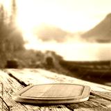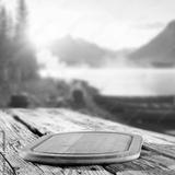Rustic wooden table with copy space for product placement or branding mockup. Scenic mountains and lake shore background