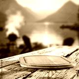Rustic wooden table with copy space for product placement or branding mockup. Scenic mountains and lake shore background