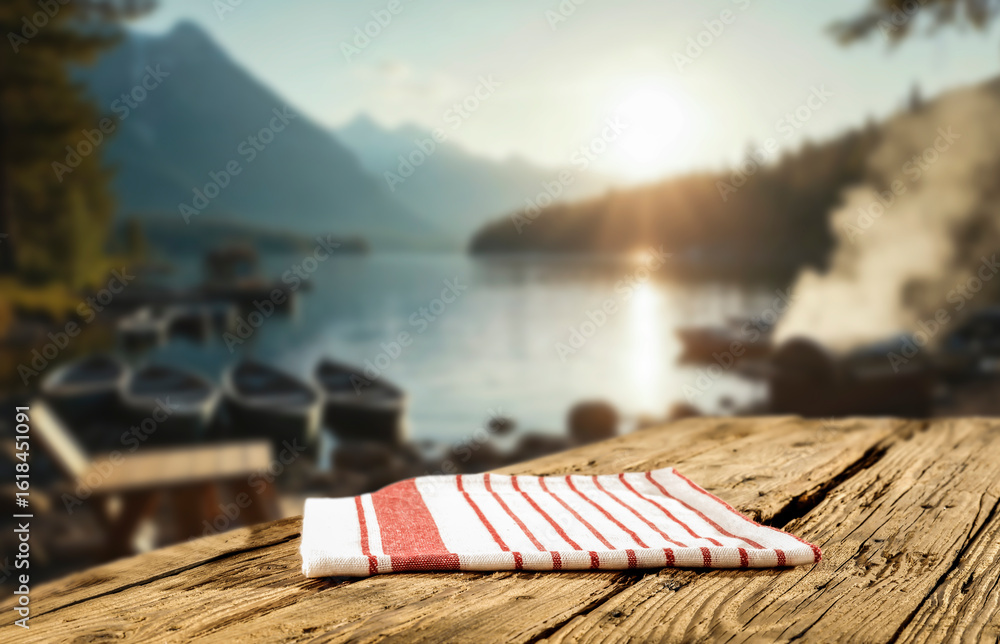 Rustic wooden table with copy space for product placement or branding mockup. Scenic mountains and lake shore background
