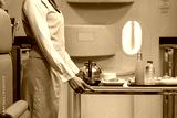 Asian flight attendants in uniform pushing a cart with food and beverages, tea, coffee, orange juice to serve passengers in the cabin during flight on the plane. Airline service concept.