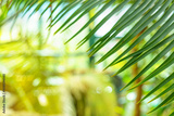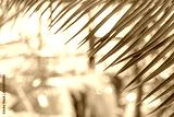 Palm leaves stretch out with sharp green points, set against a softly blurred background. The warm tones and natural textures evoke a calm tropical atmosphere.