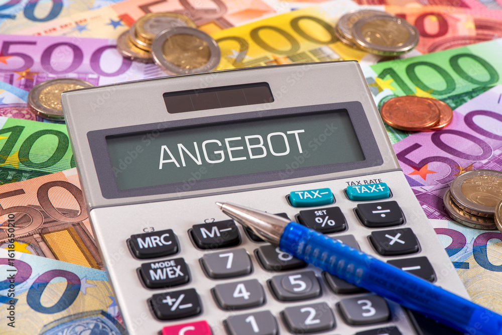 Im Display von einem Taschenrechner steht das Wort Angebot als Symbol für Angebot und Nachfrage in der Wirtschaft