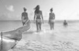 Woman feet resting on warm, sunlit beach sand. Blurred silhouettes of women by the sea, sunbathing, summer relaxation, carefree beach atmosphere, wellness, skincare, travel, summer lifestyle.
