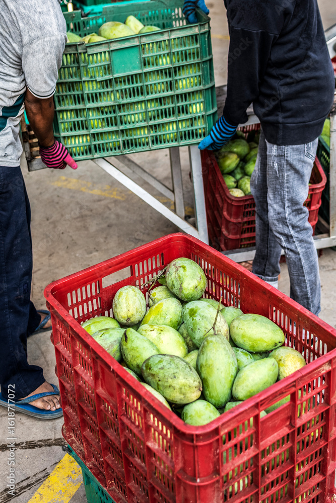 freshly harvested unripe green mango fruit in agriculture industry warehouse