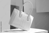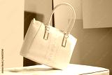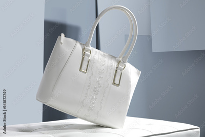 A large white women's shopping bag on a white pouf and a bright wall in the interior.