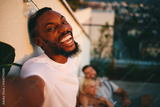 Young man taking selfie laughing and enjoying rooftop party with friends at sunset