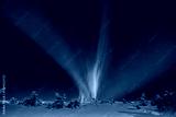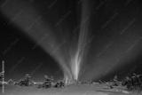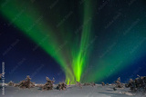 Stunning aurora borealis over Lapland night landscape. Bright green and purple northern lights dancing in the starry sky above snowy rural terrain. Long exposure photo of natural arctic phenomenon.
