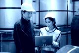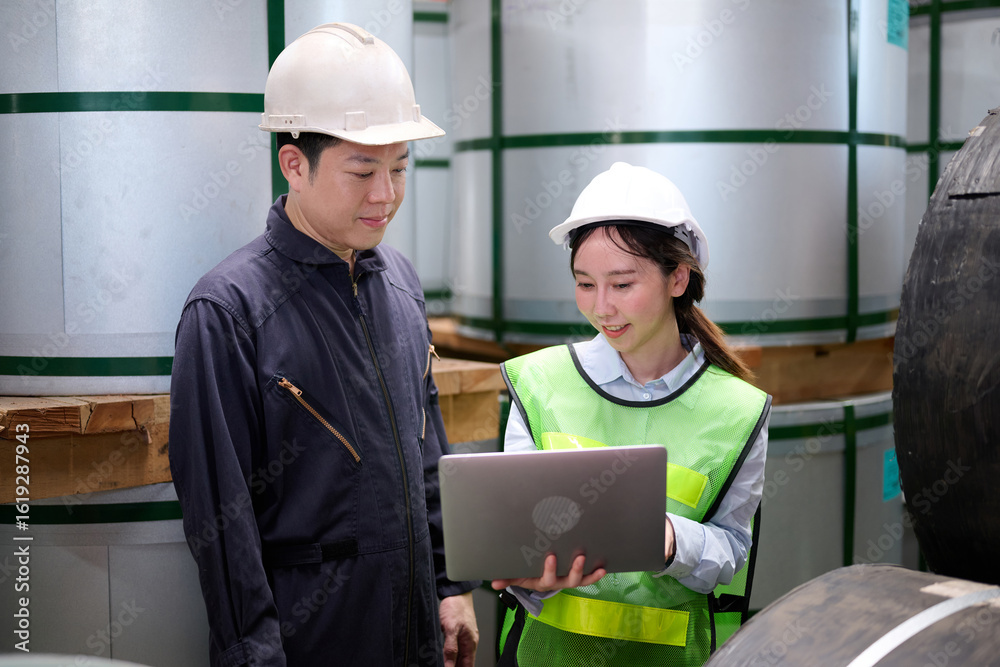Engineers or workers working on laptop computer and checking product in the metal sheet factory