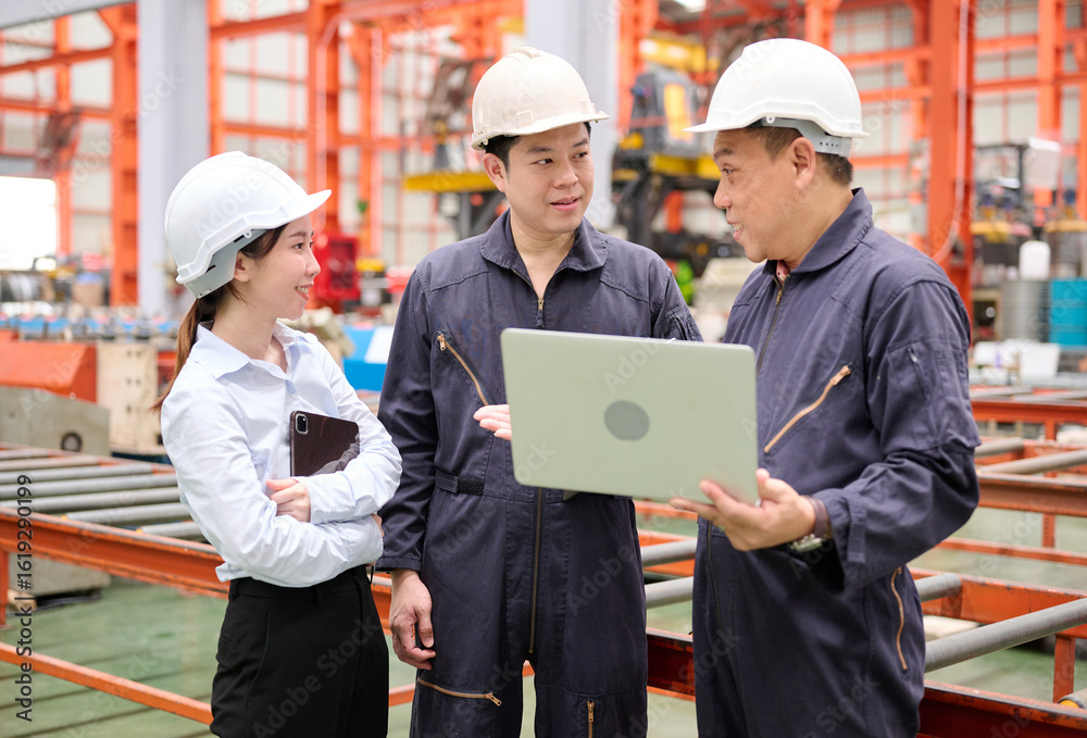 Engineers or workers working on laptop computer and checking product in the metal sheet factory