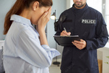 Male police officer in uniform writing report on clipboard while listening to young woman, crying, overwhelmed by emotions. Dealing with crime, reporting domestic violence, statement concept