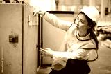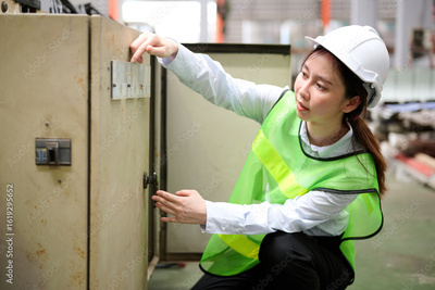 Engineer or worker checking machine control panel in the factory