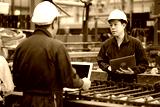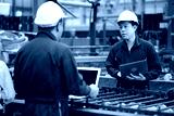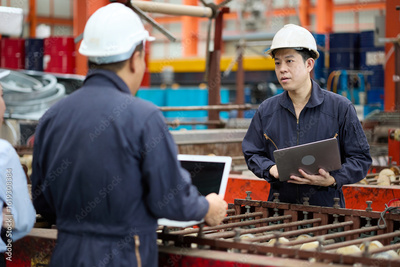 Engineer or worker talking and meeting with coworker in the metal sheet factory