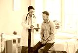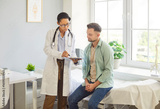Portrait of a young man patient in medical office listening to a friendly female doctor holding report file with appointment and giving consultation during medical examination in clinic.