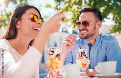 Dating in the cafe. Loving couple drinking coffee and eating fruit desserts. Dating, love, relationships