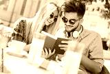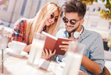 Dating. Young couple drinking coffee in the cafe. Education, relationships, love, lifestyle concept