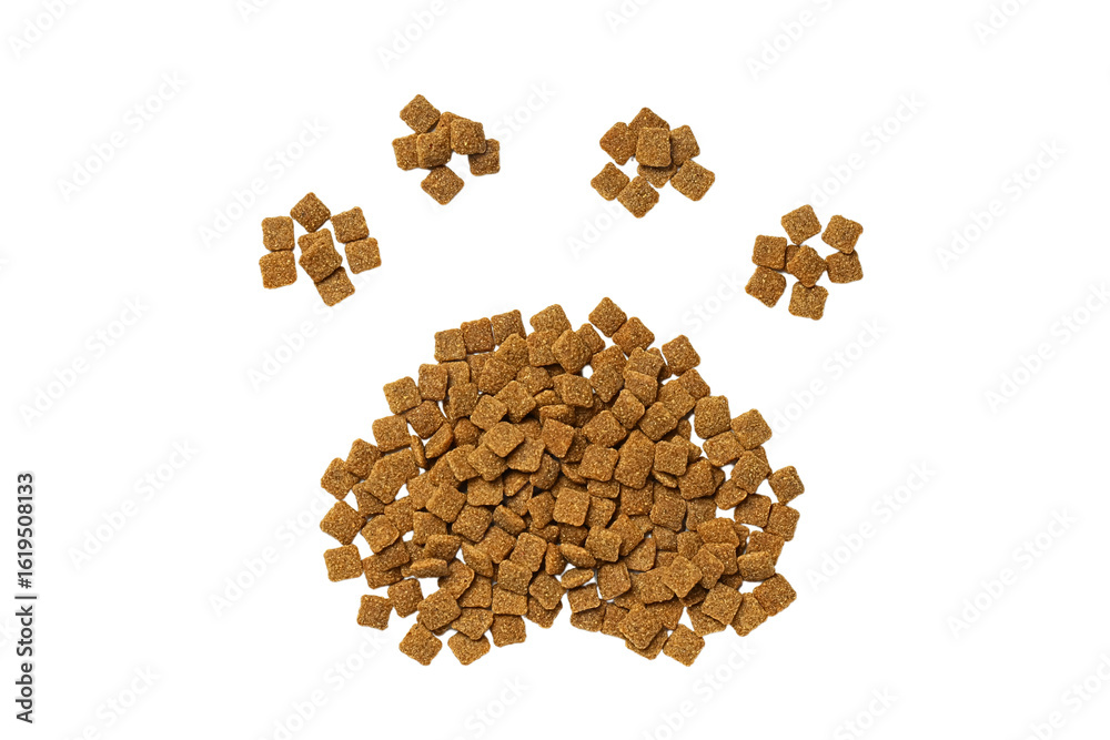 Creative layout of kibble pieces on white, isolated on white, PNG