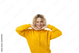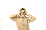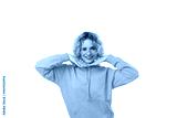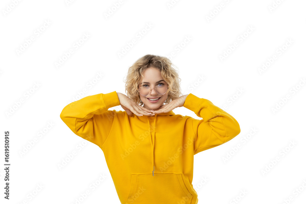 Woman smiling with hands under chin in joyful pose, isolated, PNG