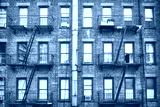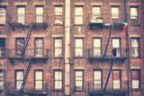 Old film retro style photo of a building with fire escape, one of New York City symbols, USA.