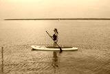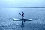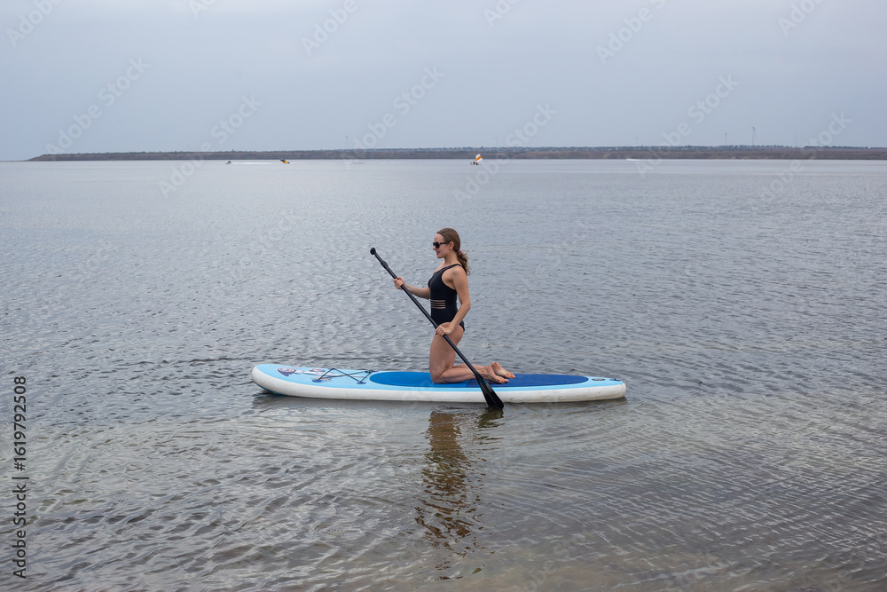 Woman on stand up paddle board. Stand up paddle boarding on a quiet lake