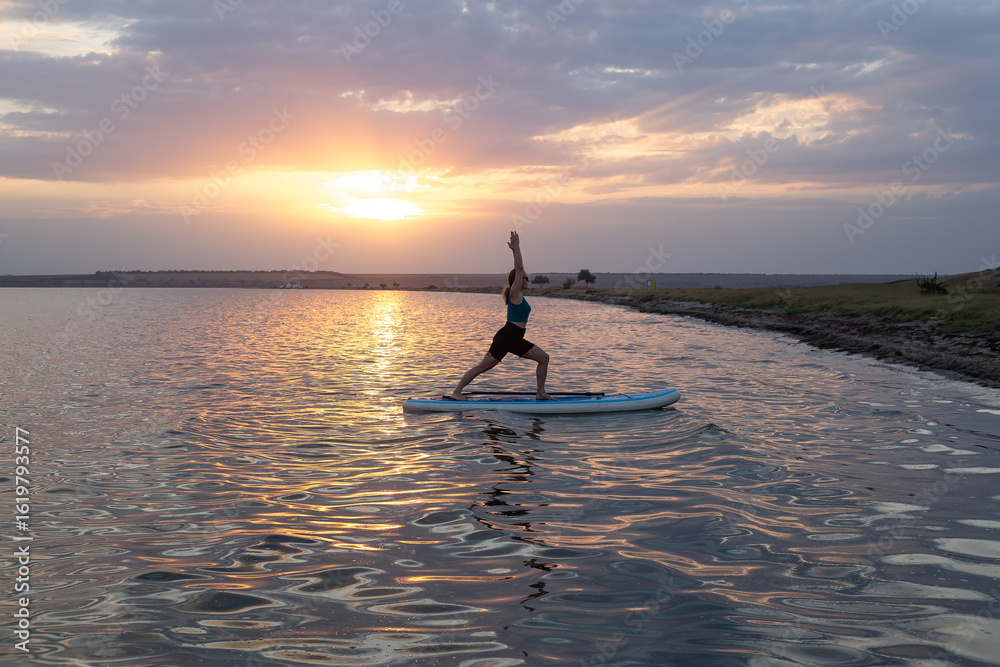 Woman practicing SUP yoga, meditating on a paddle board. Woman on sup board.