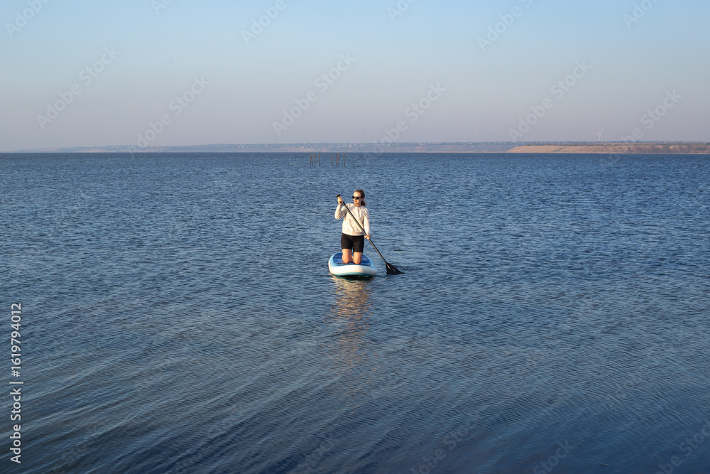 Woman on stand up paddle boarding on a quiet sea with warm summer sunrise colors