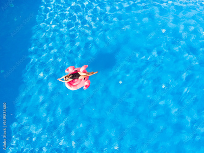 Woman on flamingo pool float in pool, drone aerial view. Summer holidays