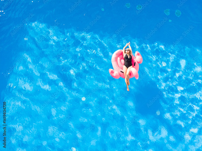 Summer holidays, relaxation. Woman on flamingo pool float in pool, drone aerial view. Enjoying summer vacations during quarantine.