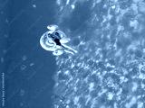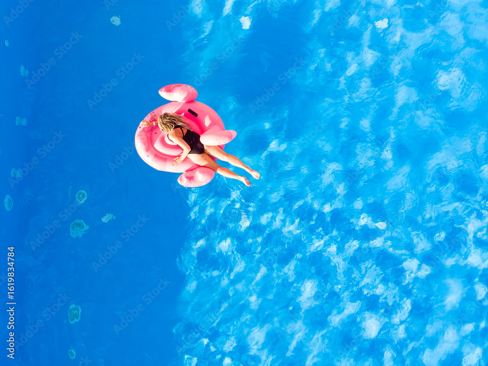 Aerial drone view of woman on flamingo pool float in pool in hotel. Summer holidays, enjoying summer vacations.