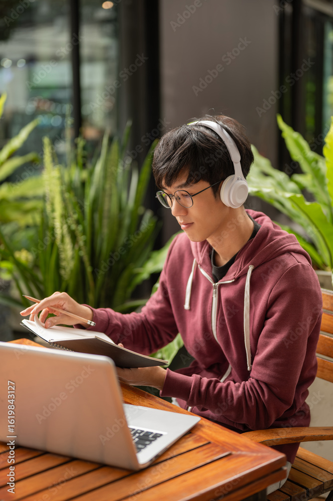 Glasses college student man wear headphone looking at notebook over laptop while sit at wooden table