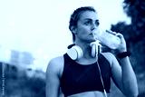 Woman in athletic attire drinking refreshing beverage during evening workout in urban setting