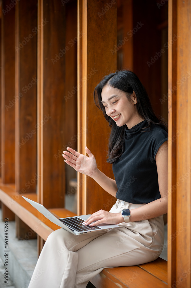 Asian woman looking and raising hand in front of a laptop sit on wooden bench in corridor or hallway