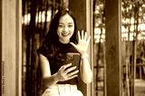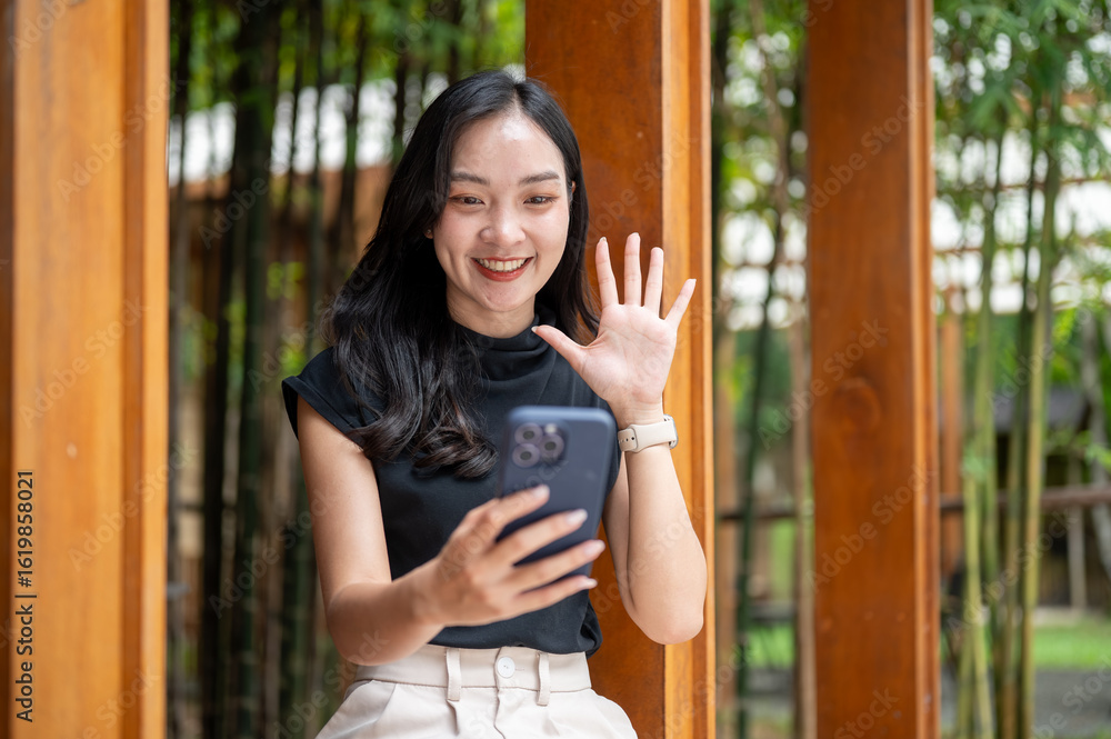 Asian woman looking at phone and waving a hand while sits in cafe's corridor beside bamboo garden.