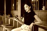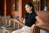 Asian woman wearings earphone is looking at phone while sitting leaning against wooden table in cafe or restaurant.