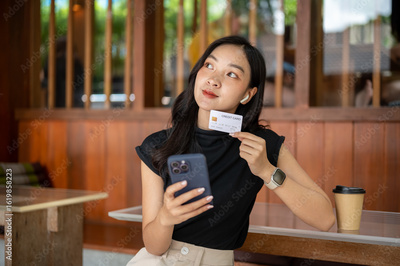 Asian woman holding credit card and phone thinking while sits at wooden table in cafe or restaurant.