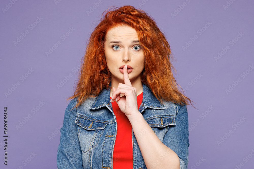 Young secret ginger woman she wear red t-shirt denim shirt say hush be quiet with finger on lips shhh gesture isolated on plain pastel light purple wall background studio portrait. Lifestyle concept.