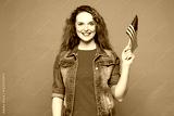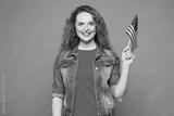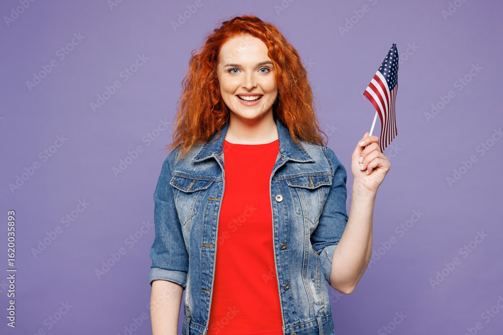 Young smiling cheerful happy ginger woman she wears red t-shirt denim shirt hold in hand American flag look camera isolated on plain pastel light purple background studio portrait. Lifestyle concept.