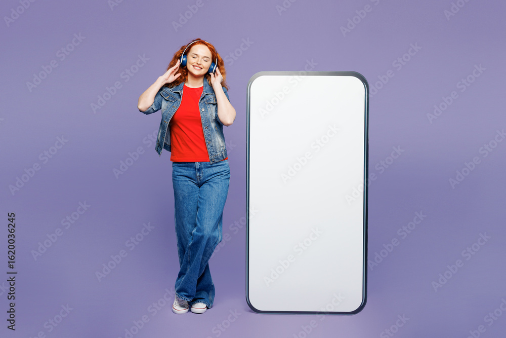 Full body young ginger woman wear red t-shirt denim shirt big huge blank screen mobile cell phone smartphone with area listen music in headphones isolated on plain purple background Lifestyle concept