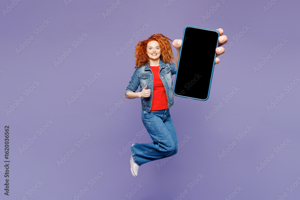 Full body young ginger woman wears red t-shirt denim shirt jump high hold in hand use blank screen mobile cell phone show thumb up isolated on plain pastel light purple background. Lifestyle concept.